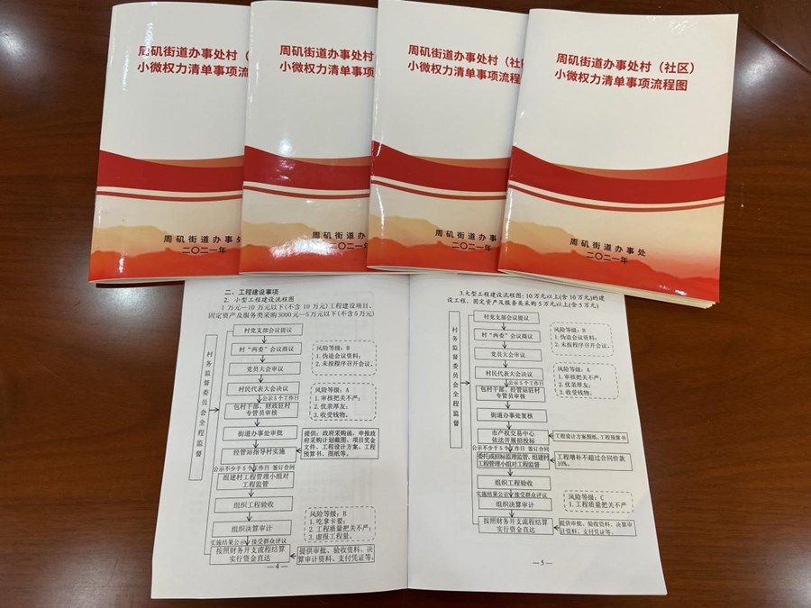 村级“小微权力”看似不大,却直接关系群众的切身利益。据悉,为进一步深化农村基层党风廉政建设,巩固基层治理基础,保障乡村振兴战略顺利实施,周矶街道纪委通过前期研讨、会商,广泛征集意见建议,制定了《周矶街道村(社区)“小微权力”清单事项流程图》,共梳理村级“小微权力”事项22项,涉及村务决策、工程建设、“三资”管理、民生保障和其他事项等五大方面。