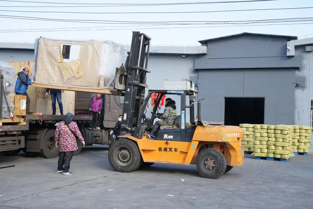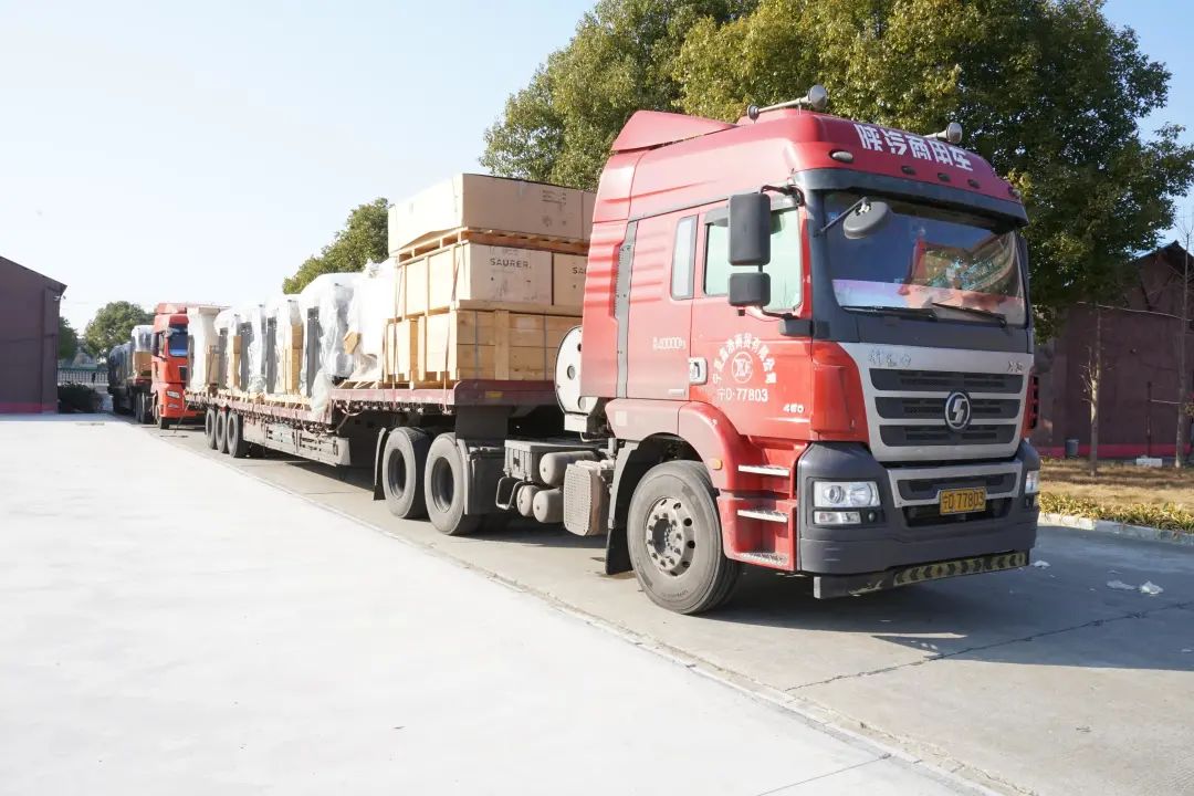 “开始卸货!”随着一声令下,工作人员将叉车停在货柜车前,将庞大的机器一一卸下,整齐排列在空置场地,并盖上透明防雨布,随时等待着安装调试。