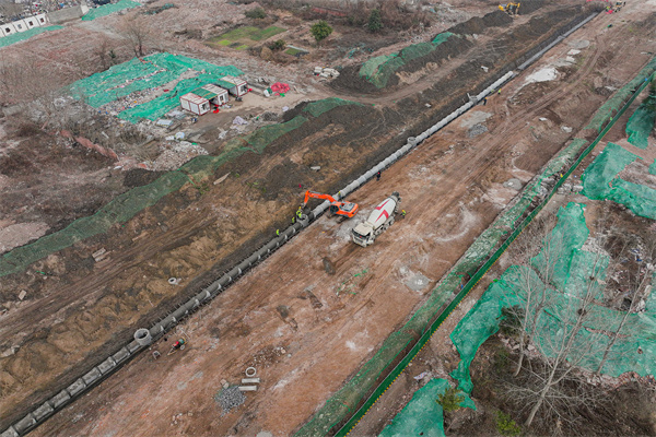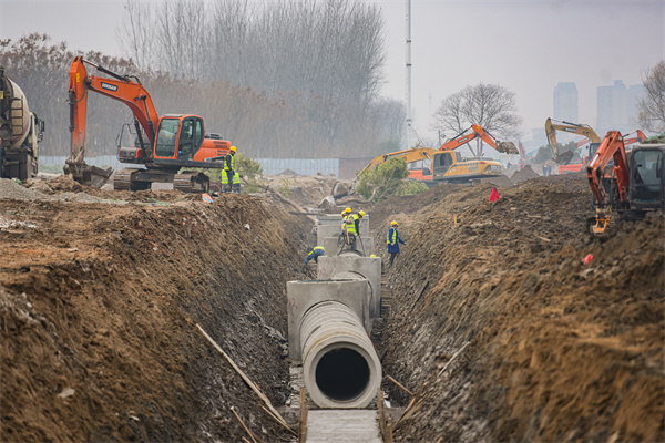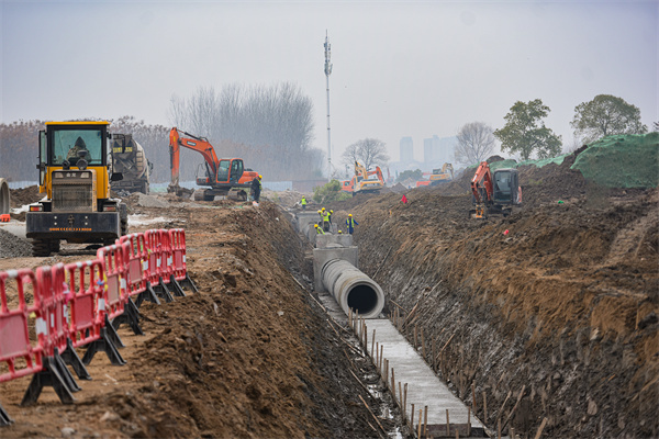 1月10日,荆江大道工程(御河路至西环段)施工现场,目前下水管道基本完成,部分标段开始填土。
