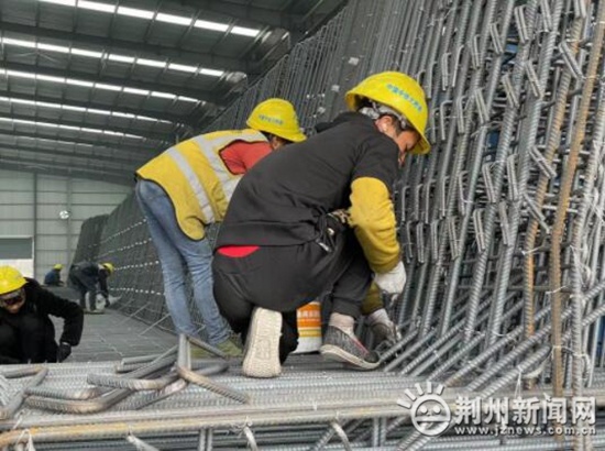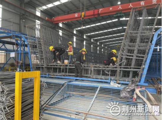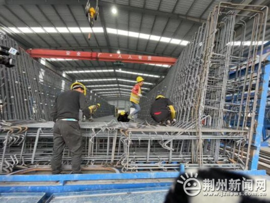 尽管临近春节,但荆州区川店镇藤店村的中铁大桥局集团荆荆铁路三标段建设正酣。记者在荆荆铁路三标段荆州北制梁场1号钢筋车间看到,工人师傅们正加班加点进行第25榀箱梁的钢筋绑扎施工。与此同时第24榀箱梁已经完成混凝土浇筑,即将进行预初张拉、喷淋养护等工序。