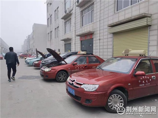 今天是城区巡游出租汽车调价的第一天,在荆州九天出租汽车有限公司,数十辆出租车排队等候调表,司机按照登记取号、拆表、升级、取表、安装并更换价格标签的顺序,有条不紊地进行调表工作。