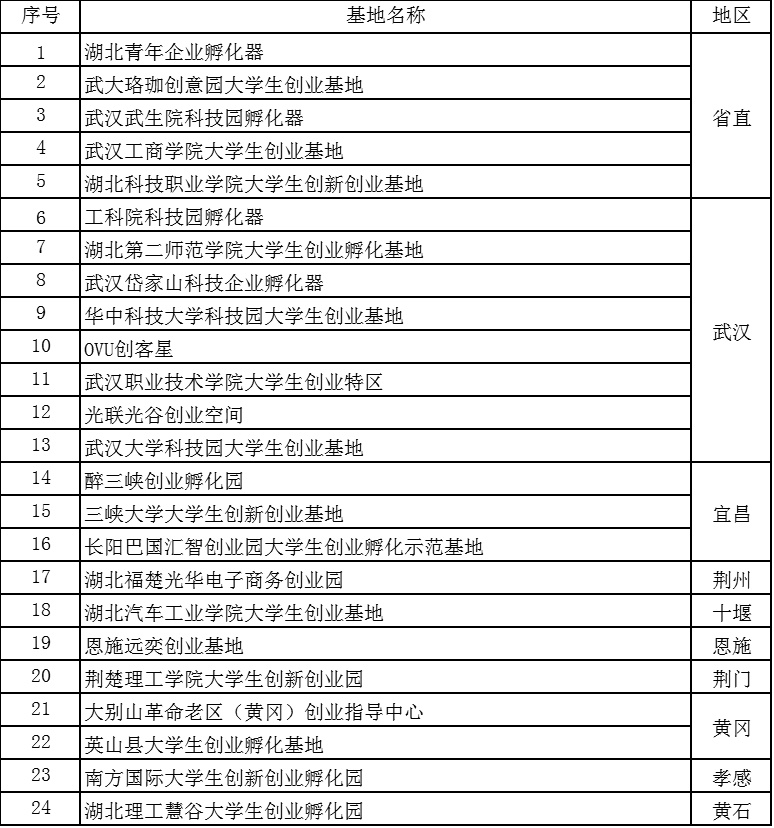 根据省厅《关于印发(试行)的通知》(鄂人社规〔2018〕2号),经自愿申报,市、州人社部门推荐,省厅组织实地核查并公示等,现认定湖北青年企业孵化器等24家单位为湖北省大学生创业孵化示范基地,有效期为2021年7月至2024年6月。荆州的湖北福楚光华电子商务创业园榜上有名!