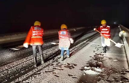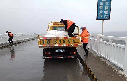 接到任务后,全市整装待发的20支公路应急保通队伍迅速行动,奔赴大中桥梁、公路渡口、急弯陡坡、易结冰路段等重点区域,抛洒融雪剂防滑料,清扫路面积雪,设立安全警示标牌、进行交通疏导。