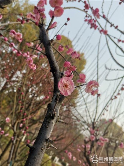 梅开百花之先,独天下而春。在荆州市中山公园的楚梅园里,有绿萼、游龙、朱砂、宫粉等多种梅花,有的含苞待放,有的翘首盼春,朵朵绽放。在楚梅园里,一些市民已经前来赏梅拍照了。