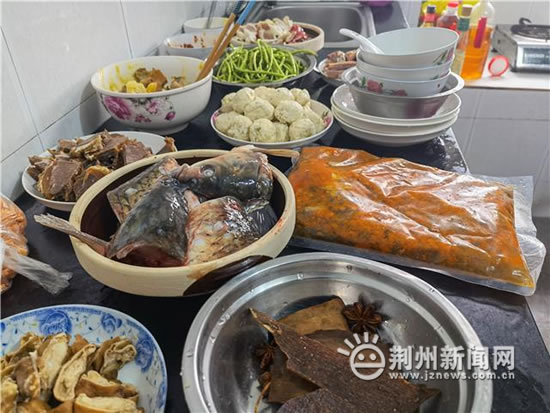 一家人一起动手,午饭做得快,还特别丰盛,粉蒸鱼、甲鱼火锅、千张扣肉、排骨藕汤、平菇鱼、豆腐丸子等极具荆州地方特色的菜肴在妯娌之间的忙活中呈现出来。中午12点多钟,团年饭做好了,孙卓、孙悦和父母们先后将菜端上桌。孙海洋一家四代人,齐聚在一起庆祝新年的到来。