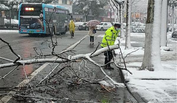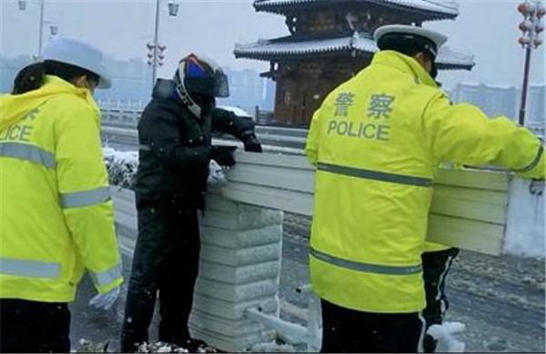 巡逻中,民警发现江津东路有树木因积雪倒伏在路面,存在较大安全隐患,民警立即清理,保证了道路稳定畅通;在凤凰大桥,民警发现两边隔离带损坏,路过的热心市民主动与民警合力将其恢复。