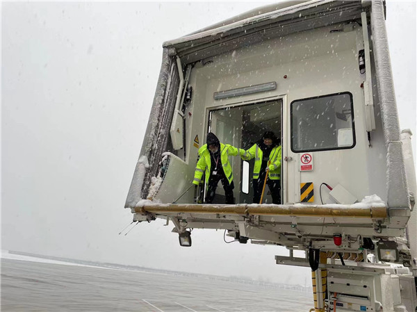 降雪前,荆州沙市机场及时关注天气情况,有序开展会商、场务勘测工作,并将全体干部职工分为现场指挥、扫雪除冰、延航处置、交通保障和后勤保障5个分队迎战降雪天气。7日晨,组织业务部门分别开展跑道雪情和吹雪作业情况检查、测试廊桥、廊桥桥头积雪清除、公共区铲雪和航站区防滑设施铺设工作,确保跑道适航和航站区地面畅通。