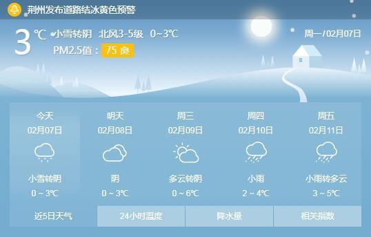 记者从市气象台了解到,今天全市大部都出现了雨夹雪转大到暴雪天气过程。预计10日--12日,荆州还将有一次降雨过程,市民要注意出行安全。