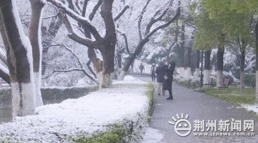雪花飘飘洒洒,一派白雪皑皑的景象呈现在荆州的街头巷尾。小桥、流水、亭台楼阁、青石板道,有了雪花的帮衬,公园的景致焕然一新,市民们纷纷拿起手中的相机,拍照留念。