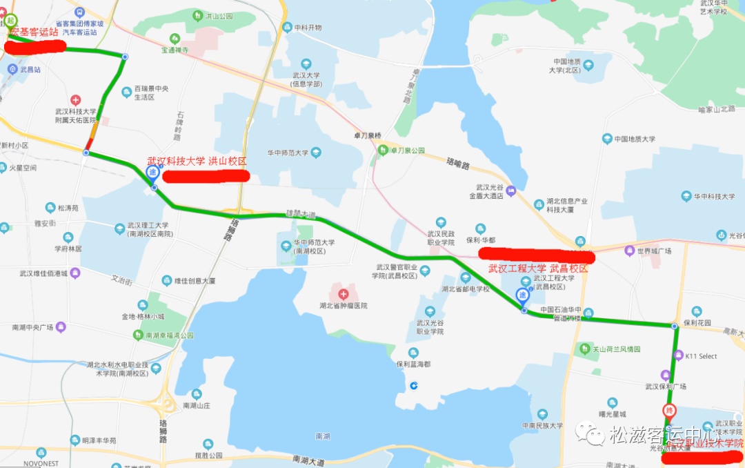 松滋→宏基客运站→武汉科技大学洪山校区(雄楚大道)→武汉工程大学→武汉职业技术学院(关山大道)