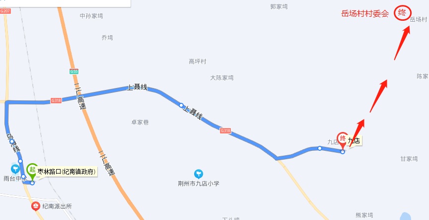 枣林、新318国道王场路口、丰收路口、九店、岳场村五组、岳场村路口、岳场村委会
