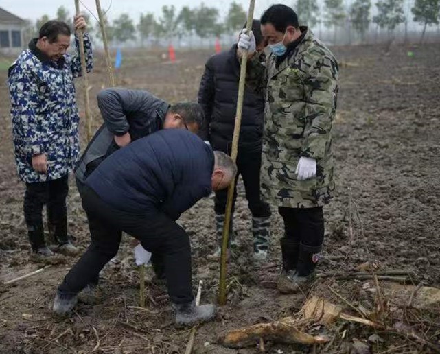 植树现场,大家三五一组,分工协作,相互配合,你扛树、我拿铲,你挖坑、我扶树,你填土、我踩实,干劲十足,共合力种下近千株意杨。