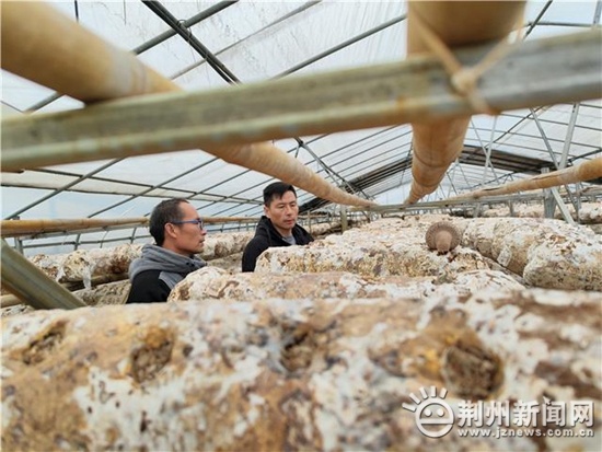 香菇大棚里,层层码放的菌棒上,灰褐色的香菇如花朵般绽放。湖北民华现代农业科技有限公司产业发展负责人余颖波和技术部经理谭文武正在棚内查看香菇长势。
