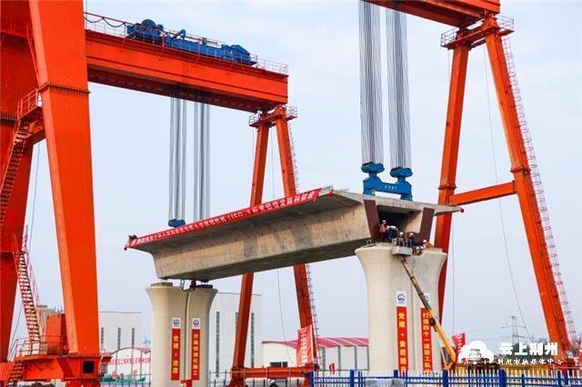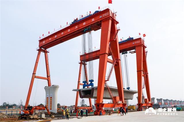 荆州新闻网消息(记者 胡威虎 通讯员 冷朝乾 张嘉欣)人勤春来早,奋战开门红。2月13日下午15时18分,荆荆铁路荆州北制梁场迎来施工关键性节点,随着现场指挥人员一声令下,长达32.6米,宽12.6米,高3.035米,重达790多吨的首榀箱梁,经过1小时缓缓升起、平行移动安稳架设在江汉运河特大桥244#-245#墩上,标志着中铁大桥局承建的荆荆铁路3标项目正式由下部结构转入线上架梁施工阶段,为2022年施工首战“开门红”,为早日建成通车奠定了坚实基础。