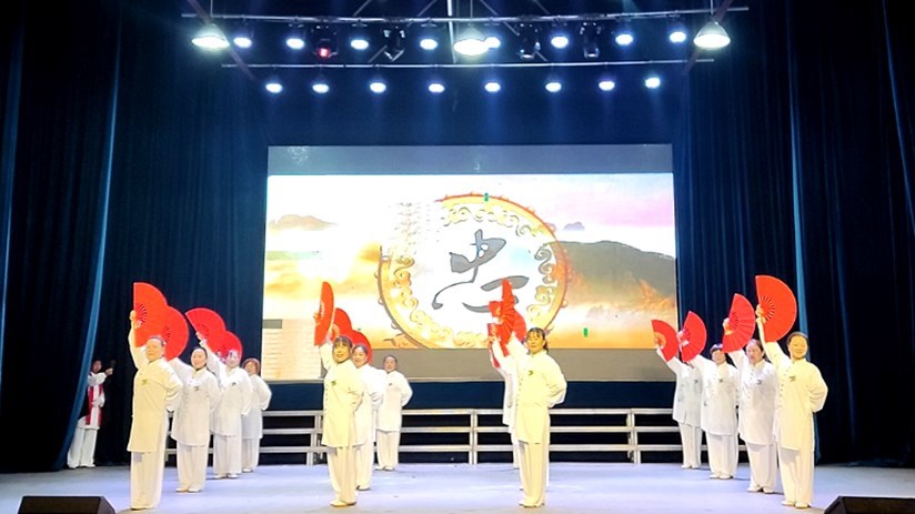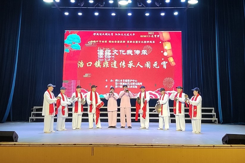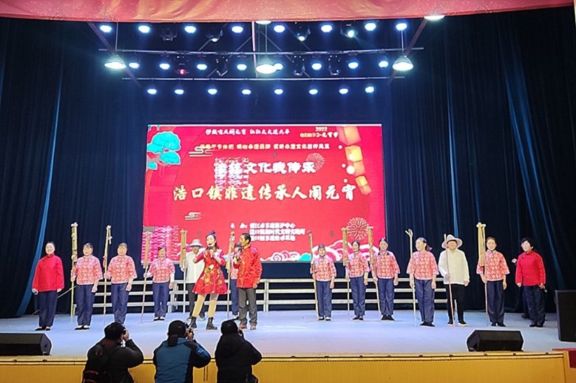在欢乐的气氛中,民俗开场舞《欢天喜地闹元宵》亮相,蚌壳精、采莲船、舞龙舞狮的师傅们同台表演,精彩纷呈。腰鼓、太极扇、锣鼓唢呐、莲湘舞也先后登场,演绎着各自的精彩。潜江民歌是国家级非遗保护项目,演出现场,潜江民歌传承人肖艳梅和浩口民间“民歌歌王”苏安泽教唱潜江民歌《连枷歌》,赢得了现场观众的阵阵掌声与喝彩。