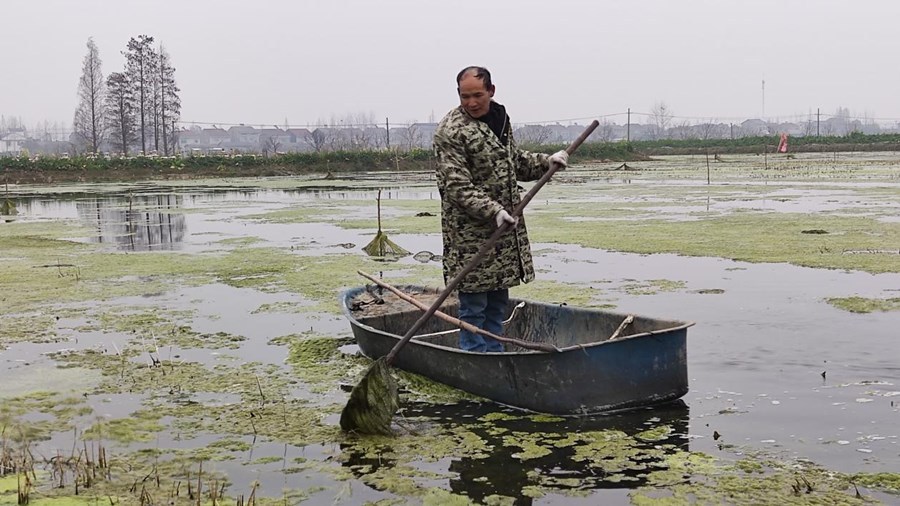 肖桥办事处5队农工徐启龙一大早就来到虾田里,忙着打捞青苔,为越冬过后的小龙虾进食做好准备,同时也便于气温回暖捕捞虾苗和大虾。