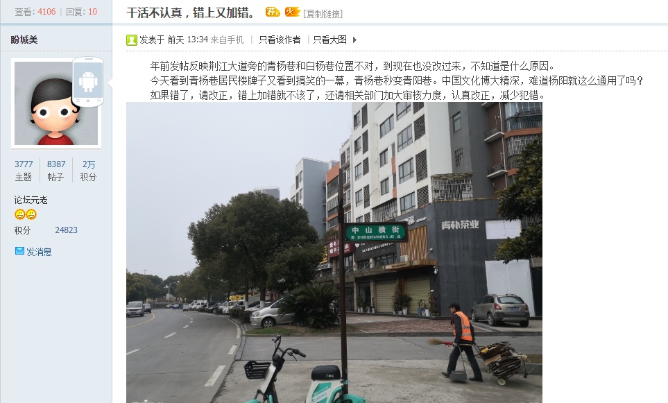 荆州新闻网消息(记者 田心怡 陈明阳)近日,沙市区的顾先生在无线荆州App上发帖称,沙市区荆江大道上的中山横街、青杨巷、白杨巷路牌位置错误,青杨巷的居民楼门牌上更大片错别字,今天(2月21日),记者来到沙市区青杨巷,看看路牌乌龙究竟是怎么回事?