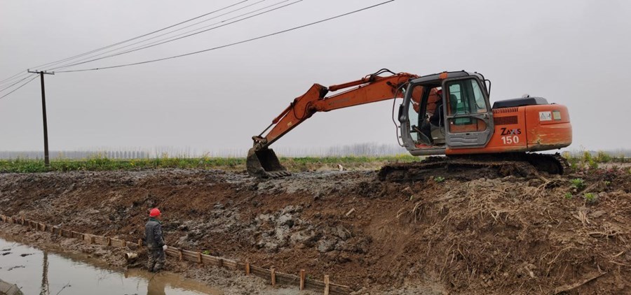 潜江新闻网讯(记者 曾俊伟)2月22日,在龙湾镇双丰片高标准农田建设项目现场,工人们或河道清淤、或护坡打桩,一片繁忙景象。