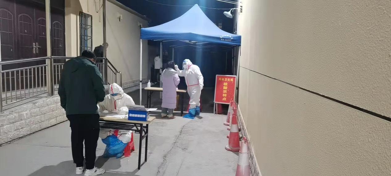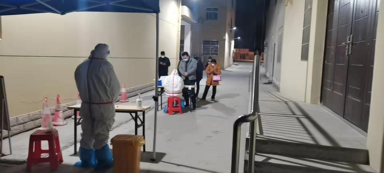 2月25日,虽然夜幕已经降临,但周矶卫生院核酸采样现场仍然灯火通明,医务人员身着防护服,佩戴口罩、面罩为重点人员进行核酸采样。