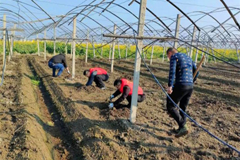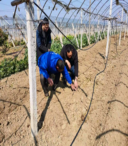 驻村工作队与市委办青年志愿服务者协助脱贫户冯小清种植“阳光玫瑰”幼苗