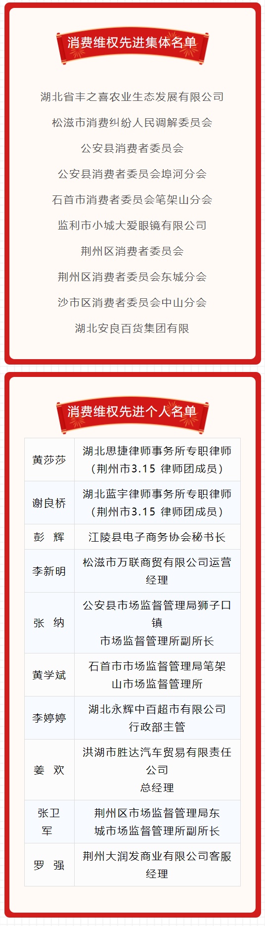 近日,荆州市消费者委员会印发《关于表彰2021年度荆州市消费维权先进集体、先进个人的决定》,授予10家单位“消费维权先进集体”荣誉称号;授予10名同志“消费维权先进个人”荣誉称号。