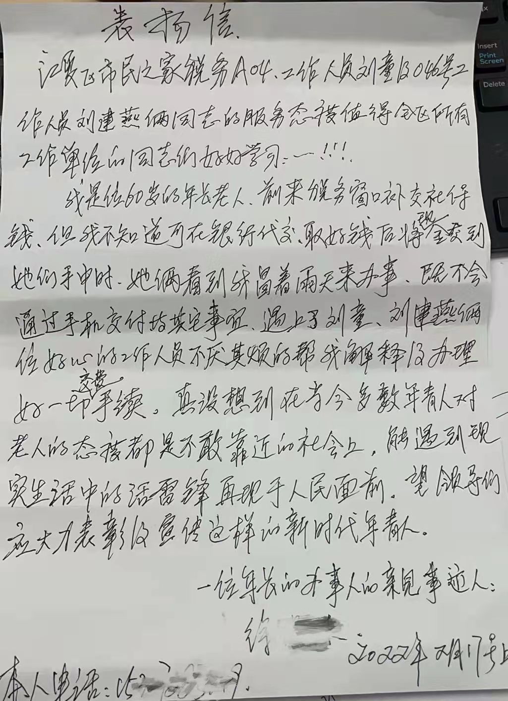 荆楚网(湖北日报网)讯(通讯员刘童、严娉)近日,武汉市江夏区税务局收到一名年过六旬的老人送来的感谢信,信中用质朴的语言表达了对税务青年贴心服务的真切感谢。