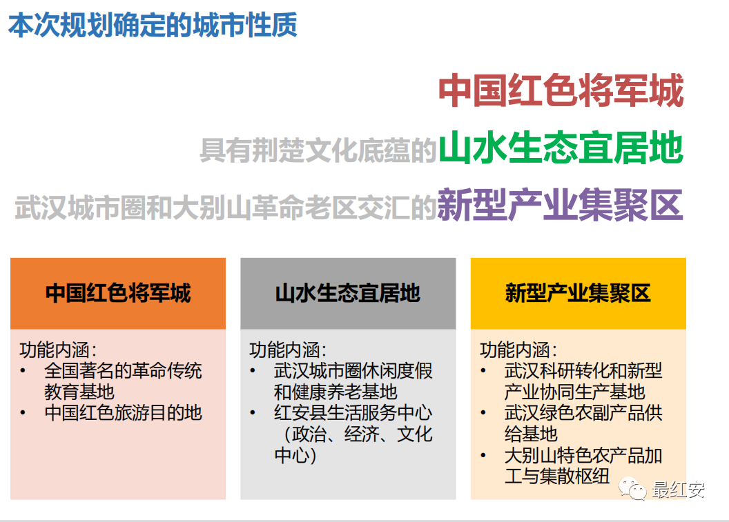 《红安县国土空间总体规划(2020-2035年)》初步方案确定的红安城市性质为中国红色将军城、山水生态宜居地、新型产业集聚区。