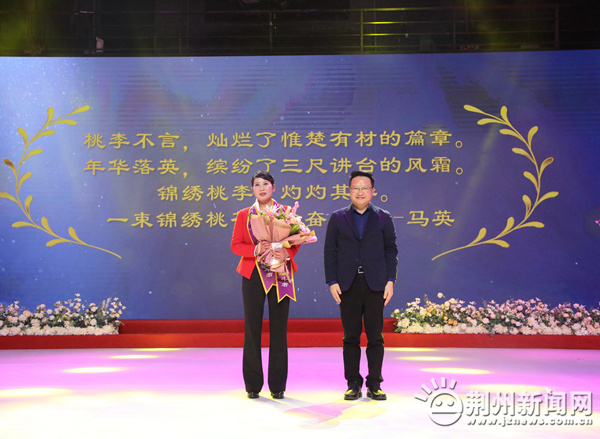图为:市委副书记周向阳为“楚楚动人•最美巾帼奋斗者”苏鸣(代领)送上祝福