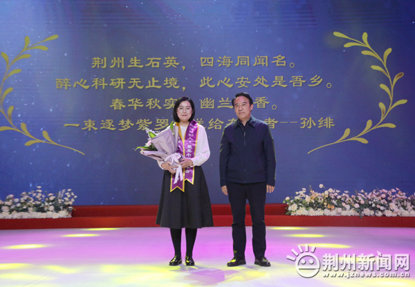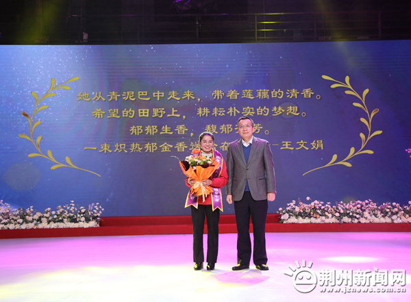 图为:市政协主席蒋鸿为“楚楚动人•最美巾帼奋斗者”马英送上祝福
