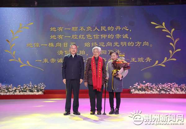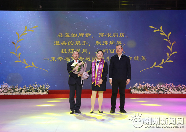 图为:市领导李水彬为“楚楚动人•最美巾帼奋斗者”王文娟送上祝福