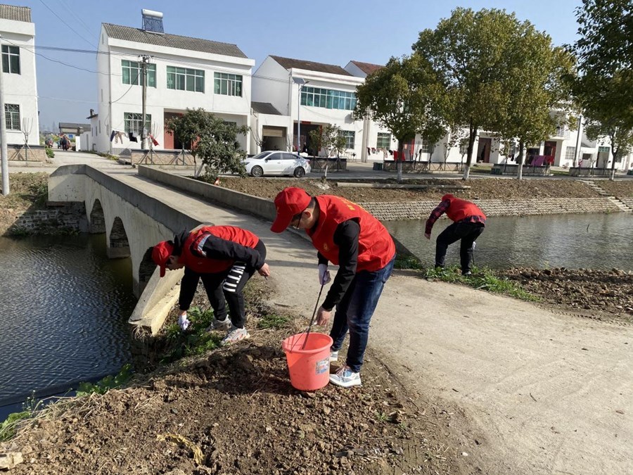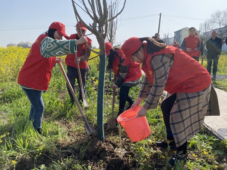 在该镇红石村植树现场,志愿者们三五成群、合理分工,你挖坑,我扶苗,你埋土、我踩实……经过2个多小时的辛勤劳动,志愿者们圆满完成了植树任务;在该镇龙湾村东电排渠,志愿者们携带火钳、编织袋等工具,沿河道捡拾塑料袋、废纸、果皮和废弃物,维护河面整洁。