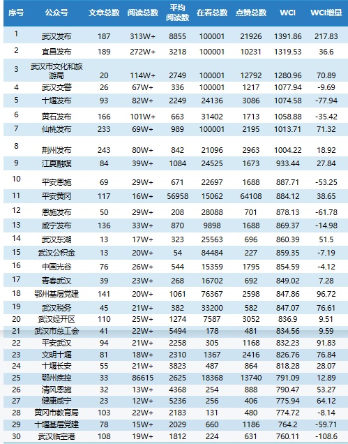 从单项指数看,本期榜单中WCI指数增长最多的两家单位是“武汉发布”和“鄂州基层党建”,分别增长217.83和96.72。从发布文章总数来看,“荆州发布”“仙桃发布”“宜昌发布”“武汉发布”“黄石发布”位列前五,发布文章总数分别为243篇、233篇、189篇、187篇和166篇。