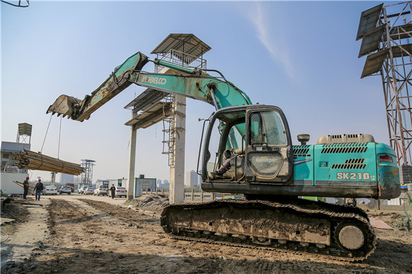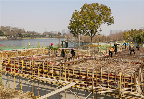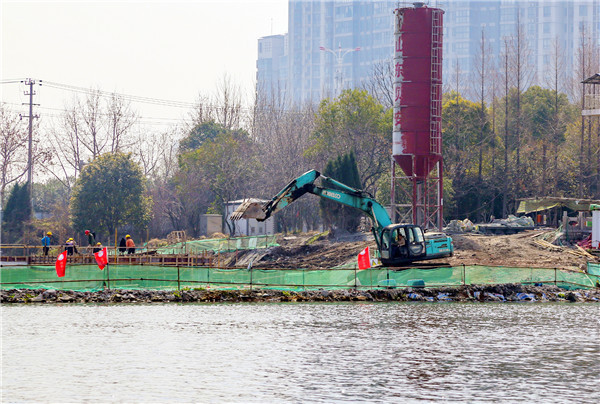 3月10日,在荆沙河节制闸修复工程现场,施工人员正在挖掘机等机械设备的配合下紧张施工。