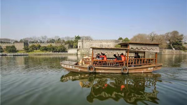 3月10日,游客乘坐游船在波光粼粼的荆州古城护城河的河面上摇橹荡舟,沁着花香的春风扑面而来,欣赏着美丽的古城风景。