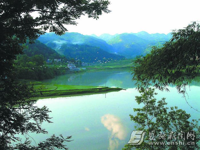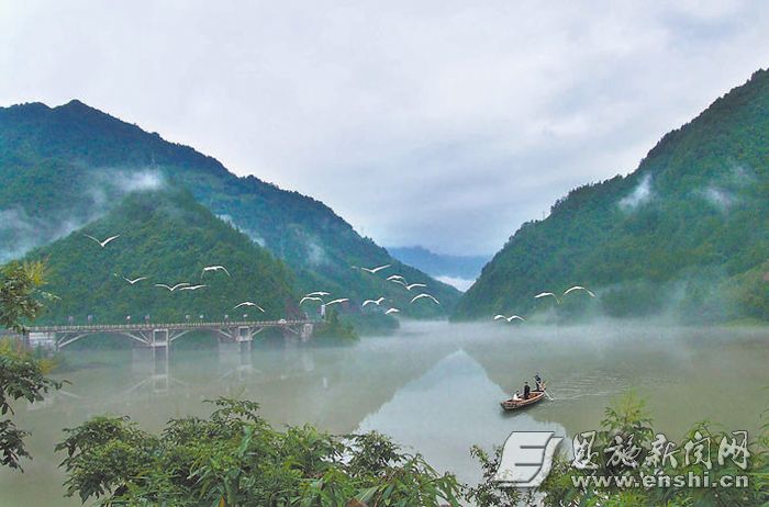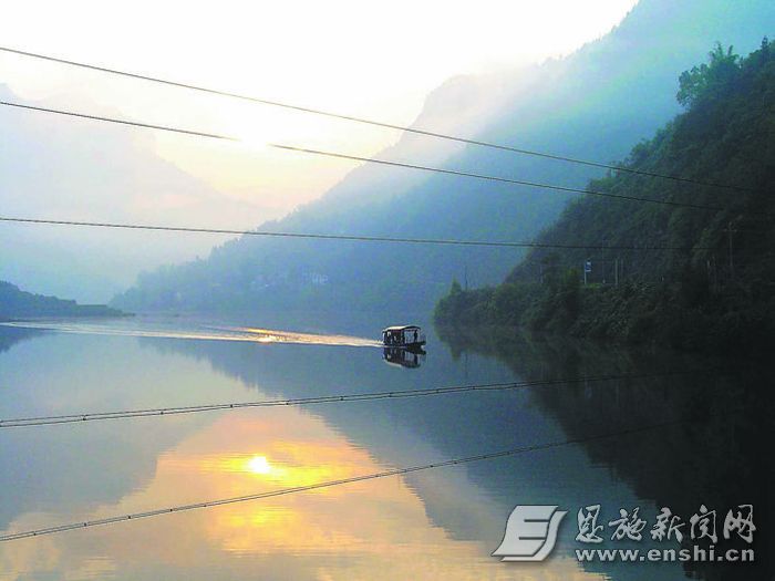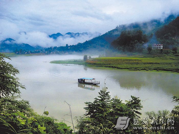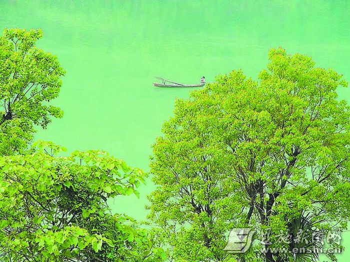 小小船儿江中游,巍巍青山两岸走。两岸的山岚露出葱茏的身影,时而陡峭,时而平缓,阳光穿过雾霭,渲染着它们的巍峨和雄浑。一缕清澈的山泉从山崖间泄出,潺潺的流水声,就像在静谧的山野中拨弹着春天的琴弦,和着雀鸟婉转清脆的啼鸣,构成天籁之音。放眼看,山坡下的农田已葱茏一片,山坡上茂密的植被已经被染成嫩绿,散发出浓浓的春意。一簇簇青翠的竹林掩藏着栋栋农舍,有鸡鸣狗吠,犹如世外桃源。仙居恩施,在这里可以窥见一斑。