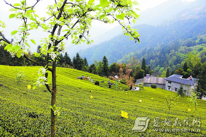 采茶、晾茶、炒茶、卖茶,茶香升腾,随风千万里。待到梨花盛开,正是采茶季节,茶园一派繁忙,到处晃动着采茶人的身影。这里的采茶姑娘们最是勤劳,眼里噙着大山养成的灵气。尽管脸被晒得通红,手被染得乌黑,但她们把脆亮的歌声留在了茶山:花枝山上风光好,醉美诗行谱新章,淡淡茗香醉远客,浓浓深情敬爹娘。歌声如溪水般清澈透亮,在茶园中荡漾,让人心醉。