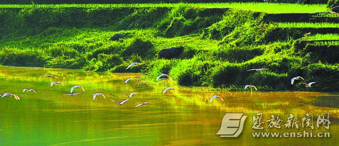 一垄麦绿,一抹鹅黄,一湾碧水,错落有致,交相辉映,构成白鹭家园的底色。一年四季,河流两岸色彩斑斓。“绿水青山就是金山银山”理念已经深入人心,当地退耕还林、退渔禁捕,因地制宜,大力发展茶叶、水果、蔬菜等生态农业,铺就了一条致富路,也为清江两岸生态保护带来福祉。