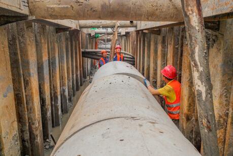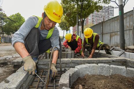 3月16日,长港路(塔桥路至红门路)雨污分流及路面恢复工程建设现场,工人正在安装强弱电盖板预制,现场一片繁忙景象。