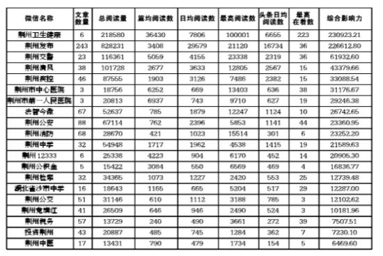 本次统计的是2022年2月1日至2022年2月28日的数据,涉及50余家单位。2月,“湖北荆州交警”获得微博榜第一名;“荆州卫生健康”获得微信市直榜第一名;“今日石首”获得微信县市榜第一名。