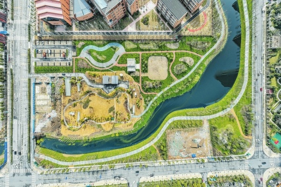 日前,无人机从空中俯瞰沙北新区水系工程二区景观,蜿蜒的水系好似一条碧绿色的丝带环绕沙北新区,绿色草坪生机勃勃,景观带内春意盎然。