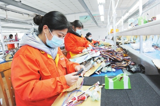 3月19日,荆州市新发电子科技有限公司车间内,工人们正在盘电线、缠胶带、做检测。