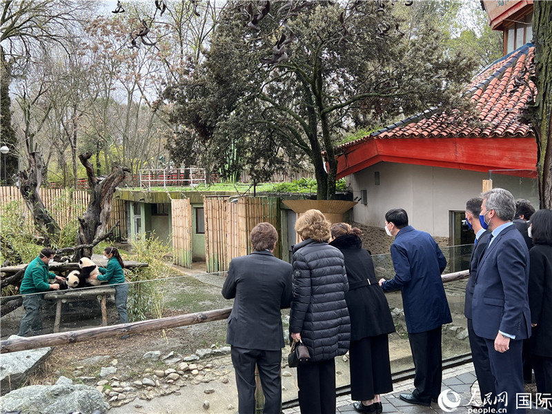 | 嘉宾在马德里动物园熊猫馆前合影。人民网记者 姜波摄 |