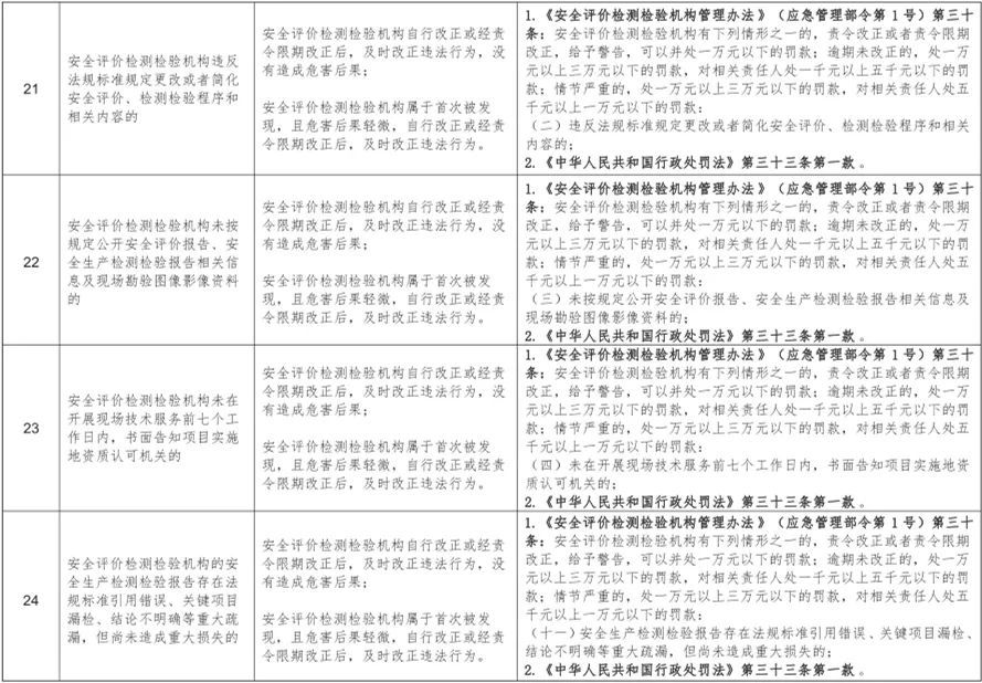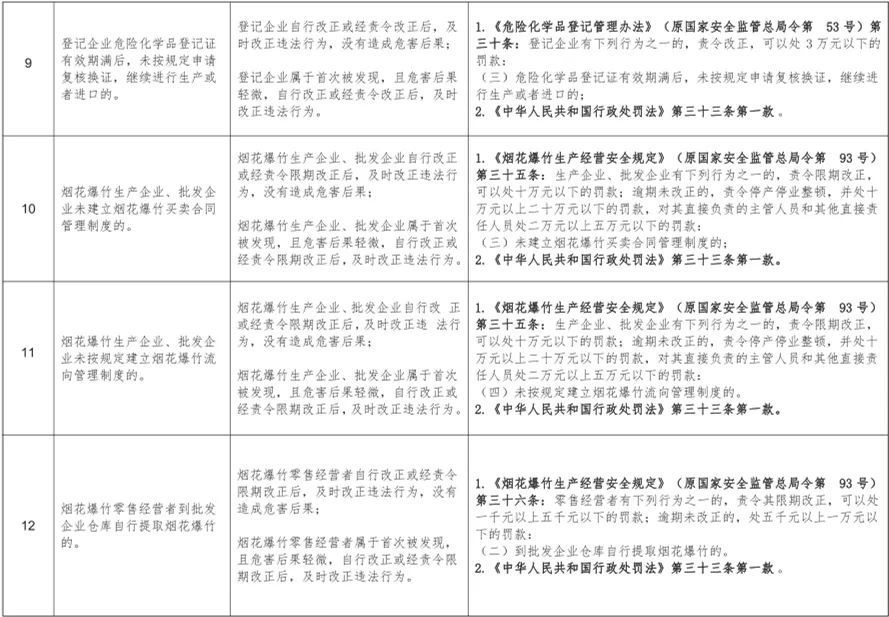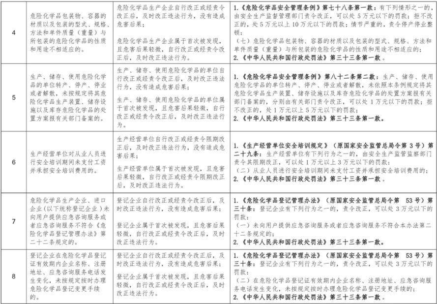 《清单》对危险化学品生产企业安全警示标志设置、风险辨识评估、应急预案评审、事故风险告知、安全教育培训、安全评价检测检验等类别24项轻微违法行为,属于首次被发现并及时纠正,且危害后果轻微的,不予行政处罚。