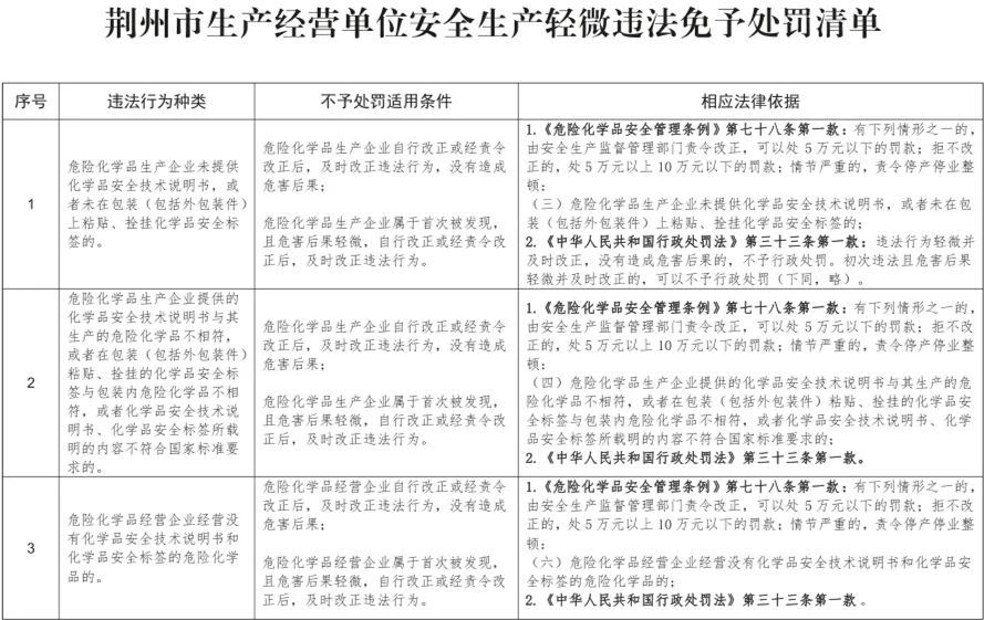 为持续深入推进安全生产领域“放管服”改革,进一步优化营商环境,助力企业持续健康发展,日前,市应急管理局结合我市实际,修订并完善了《荆州市生产经营单位安全生产轻微违法免予处罚清单》,规定24项安全生产轻微违法行为不予行政处罚。