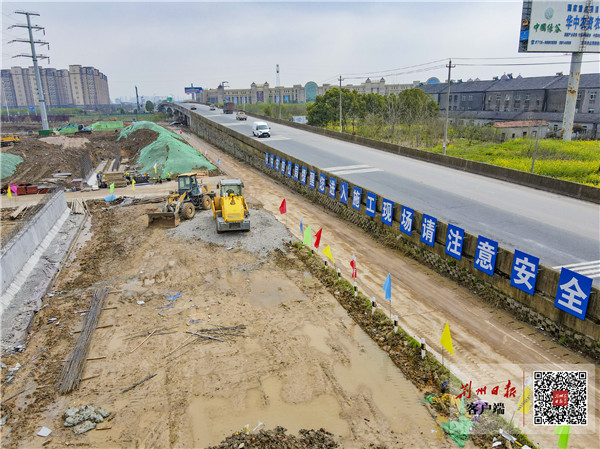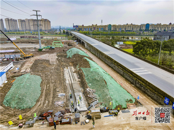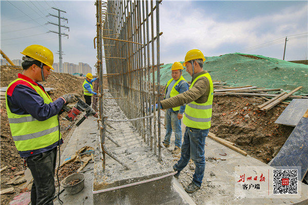 3月23日,在荆州复兴大道跨江汉运河桥工程项目现场,工人们在进行基建施工作业。