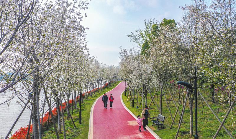 3月23日,市民在随州城区白云湖畔樱花公园樱花大道观赏樱花。连续阴雨天气终于放晴,近千株竞相怒放的樱花吸引市民和游客前来踏春赏花。 (随州日报全媒记者李文军摄)