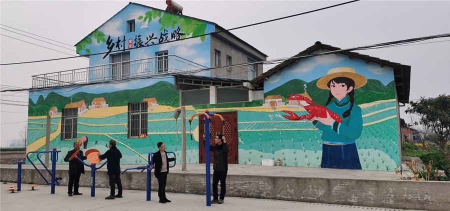 沿着街道一路前行,行至田间小路,放眼望去,纵横交错的虾稻田、干净整洁的水泥路、小巧精美的壁画、窗明几净的房屋……一幅清新美丽乡村新画卷尽收眼底。