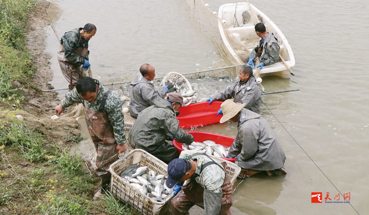 3月23日,湖北叫湖神风种养殖有限公司养殖基地,一个个鱼塘波光粼粼,村民们忙着将拉网收获的鲈鱼装箱、运上车,一派丰收的场景(如图)。