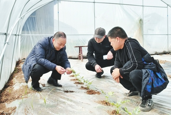 3月27日,松滋市涴市镇报德寺村一个大棚里,长江大学园林学院朱进教授正在为当地西瓜种植户进行技术指导。