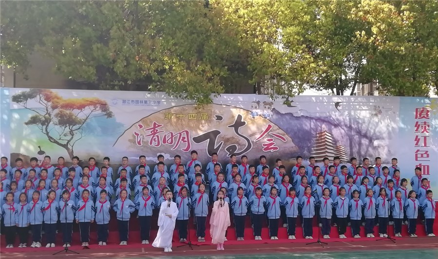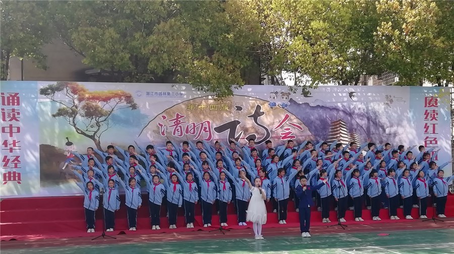 清明诗会在诗朗诵《清明缅怀英烈》中拉开序幕,随后,学生和老师用饱含深情的诗配唱、诗配舞、诗朗诵等方式,将古诗诵读《春之歌》、赛诗《春天桃李杏花开》、诵唱《声律启蒙》、诗朗诵《弯弯的月儿小小的船》等十多个节目一一呈现。精彩的表演、慷慨的陈词将红色思想播洒。